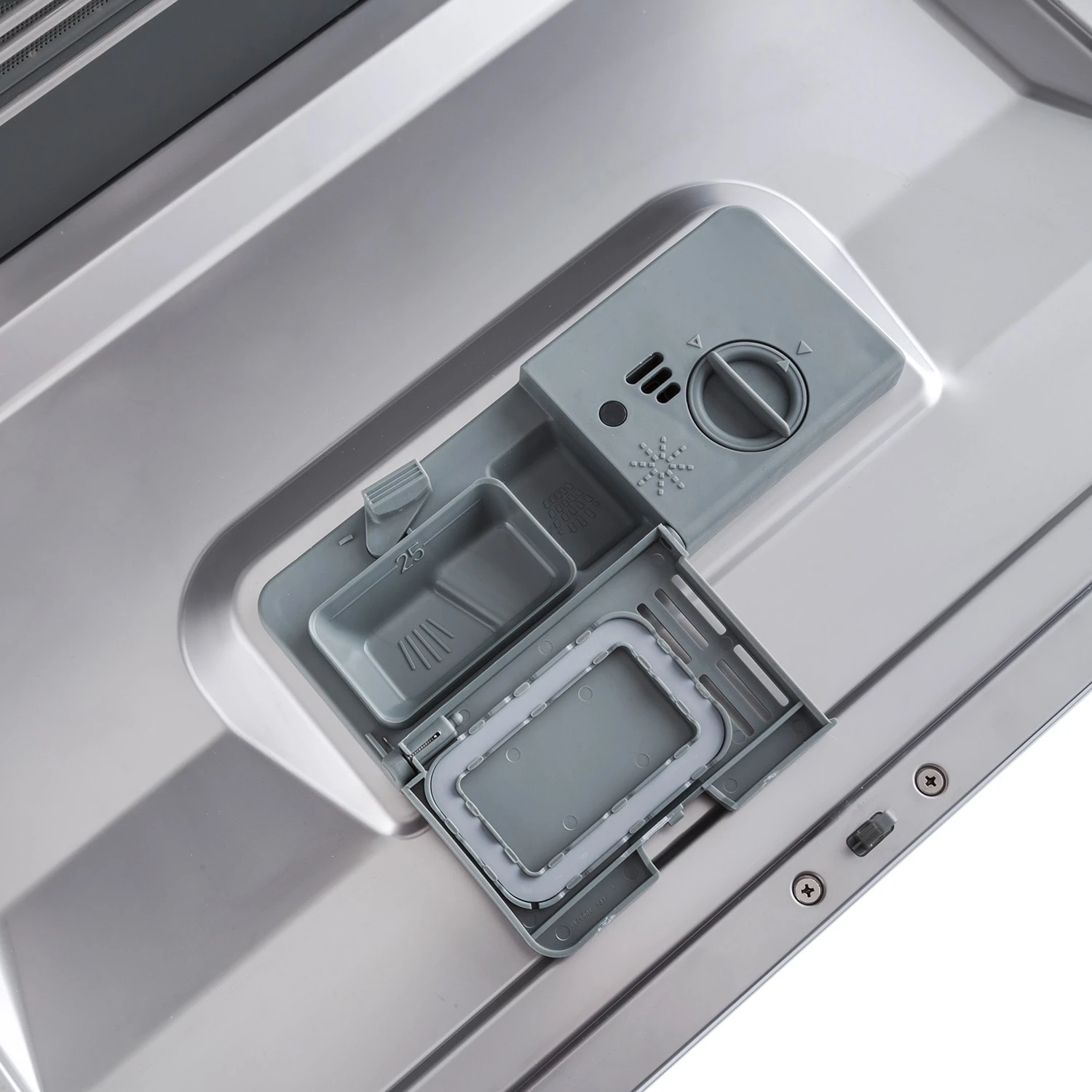 • zwei Kontrollleuchten informieren über notwendige Nachfüllungen von Reinigungssalz und Klarspüler