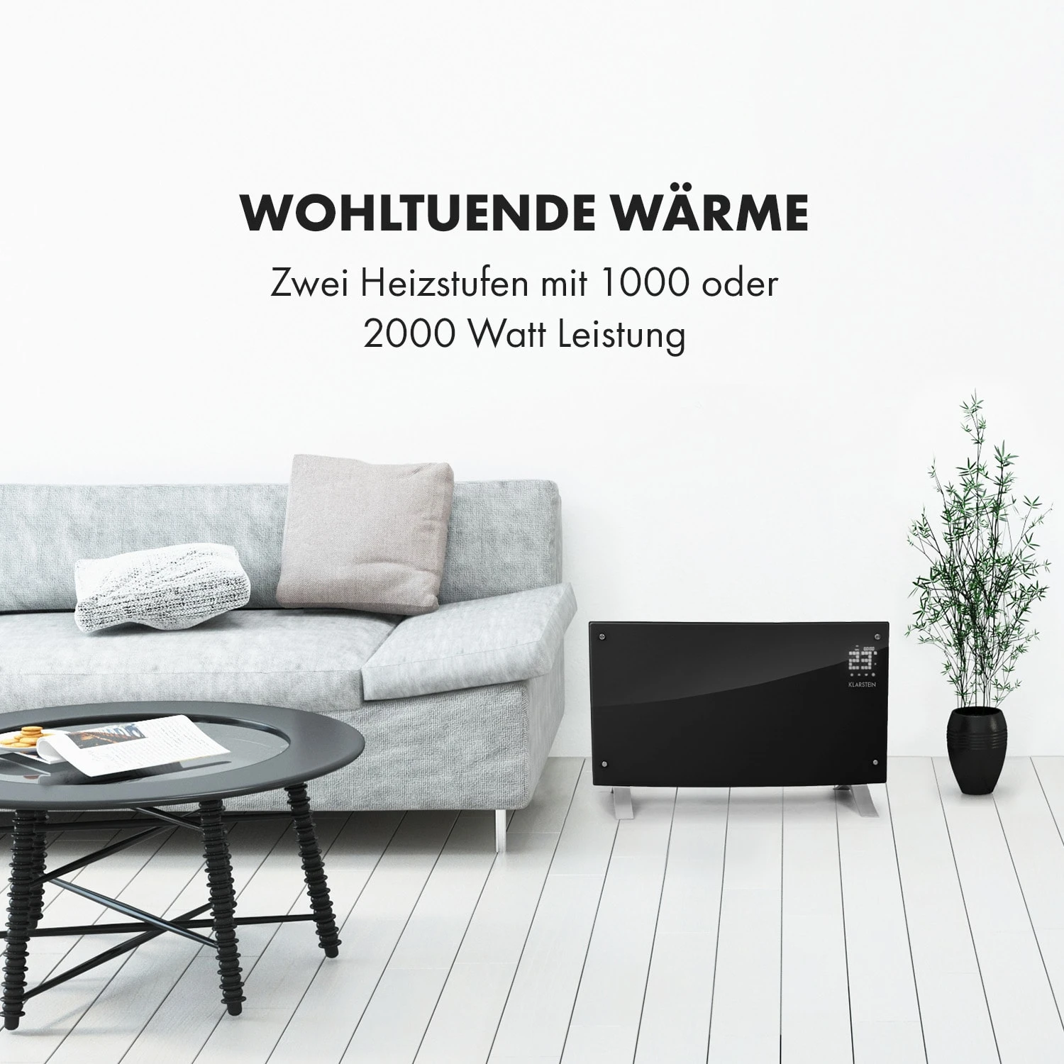 Das Klarstein Bornholm Curved Ambient Konvektionsheizgerät sorgt für eine gleichmäßige Wärme bis 45 °C in Räumen mit max. 40 m2.  Mit zwei Heizstufen von 1000 oder 2000 Watt erwärmt das starke Heizgerät jeden Raum schnell und zuverlässig. Über ein Thermostat wird stets gradgenau die Wunschtemperatur eingehalten. Der ECO-Modus senkt den Energieverbrauch auf ein Minimum: Das schont die Umwelt und den Geldbeutel. Dank Spritzwasserschutz kannst du das hochwertige Heizgerät selbst in Feuchträumen aufstellen, über die Timer-Funktion minutengenau programmieren oder bequem per Fernbedienung steuern.