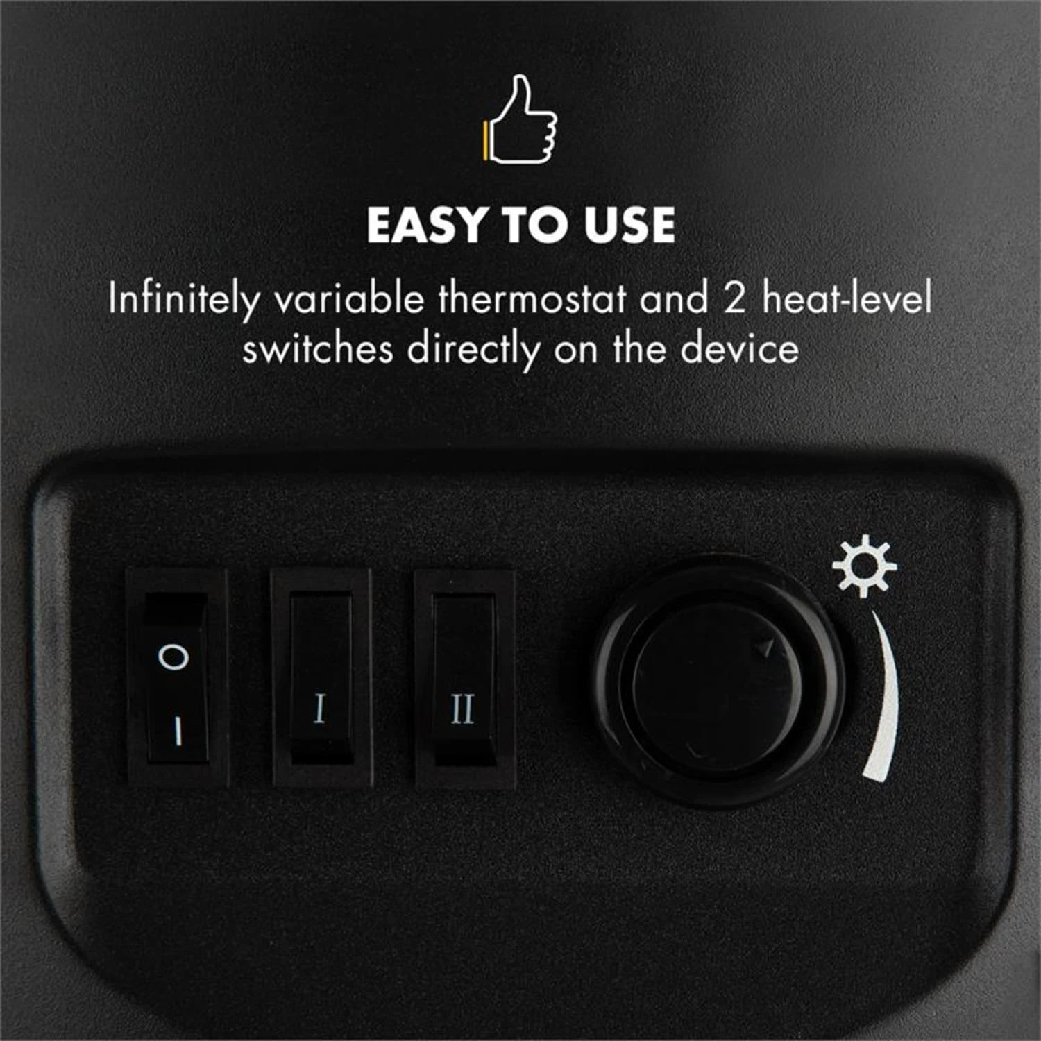 Die Flammen züngeln völlig unabhängig von der Heizfunktion auch in lauen Sommernächten. Für angenehme Wärme sorgt die zuschaltbare Heizfunktion, die bei wahlweise 900 oder 1800 Watt Räume beheizt. Über einen Drehregler lässt sich auf Wunsch die Wärme per stufenlosem Thermostat anpassen. Die Bedienung des Elektrokamins erfolgt dabei einfach und direkt am Gerät: Die Schalter hierfür sind dezent hinter der Ofentür verborgen.