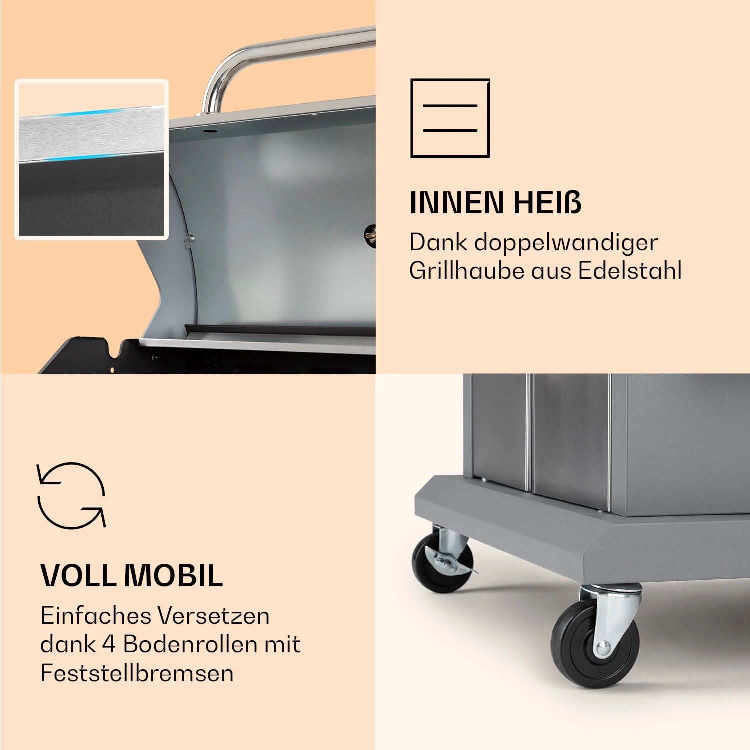 • doppelwandige Haube aus Edelstahl für passives Grillen