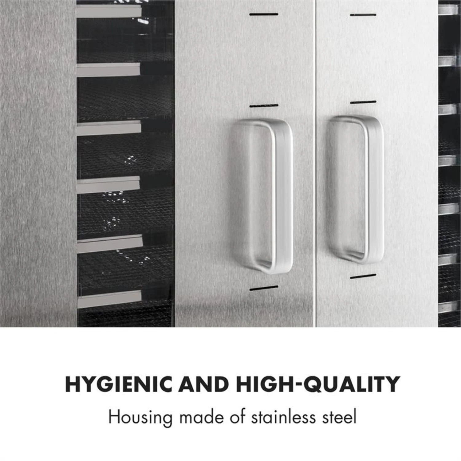 Die Reinigung des Dörrautomaten nach Beendigung des Trockenvorgangs ist völlig unkompliziert: Die Einschübe aus Edelstahl lassen sich problemlos abspülen oder in der Spülmaschine reinigen. Das Gehäuse ist aus gebürstetem Edelstahl und ein Schmuckstück in jeder Küche.