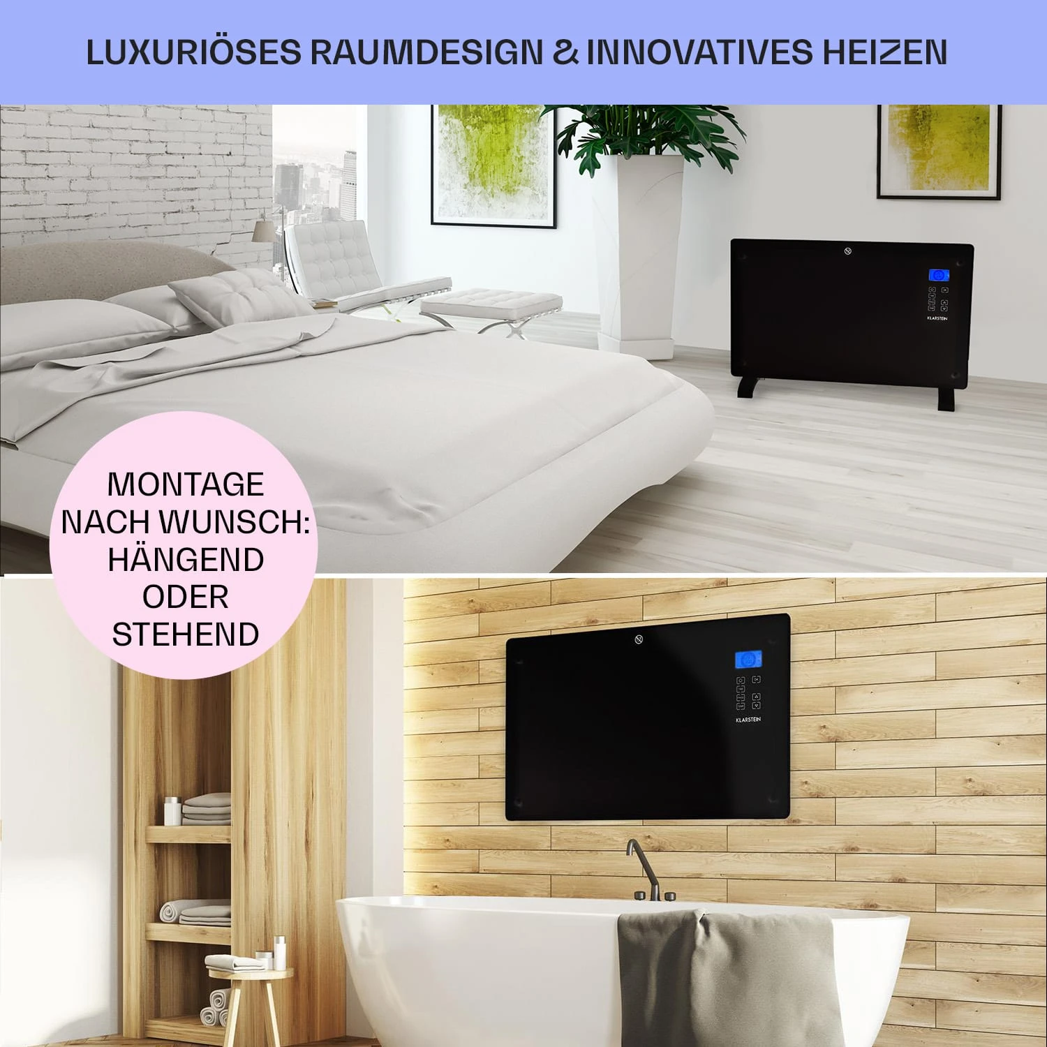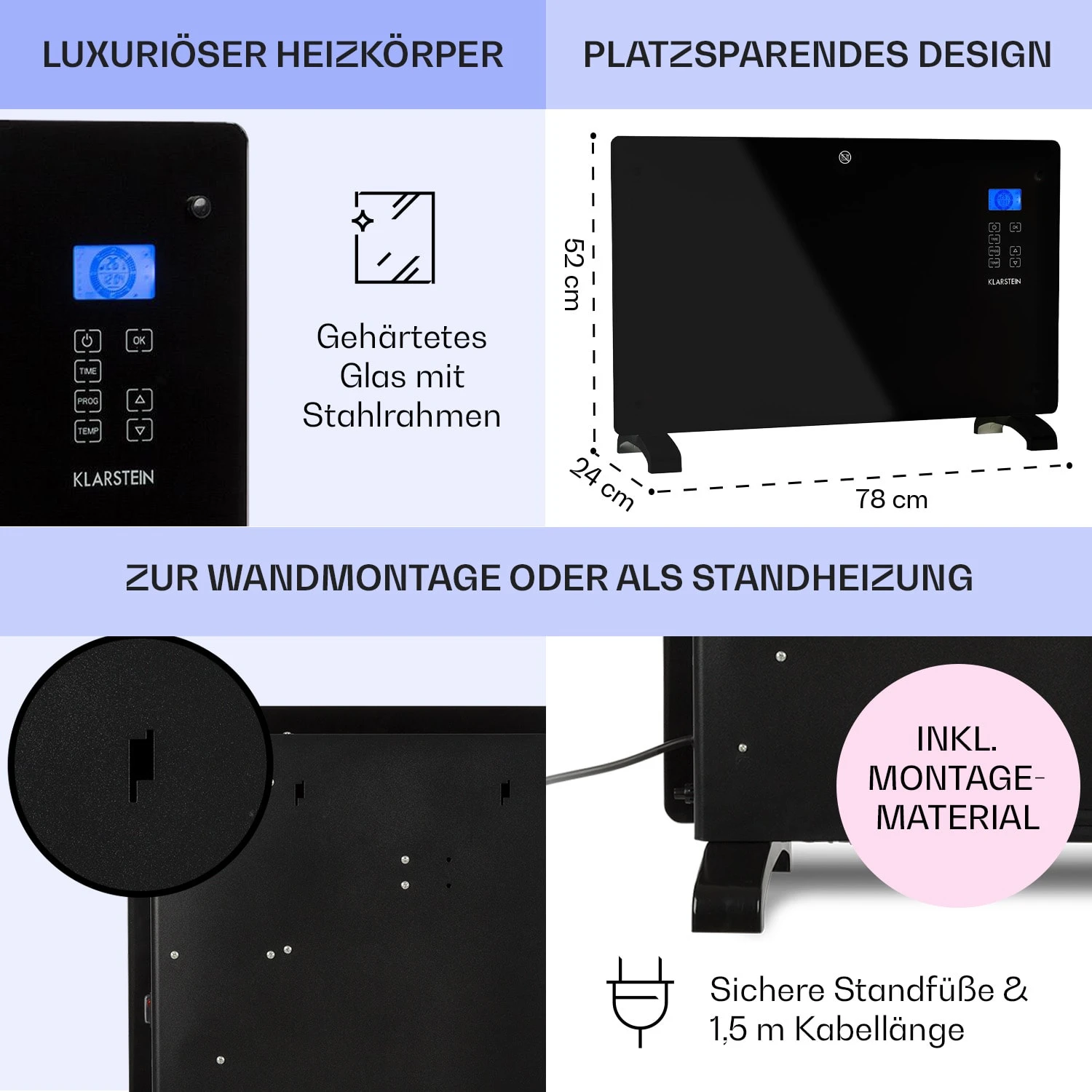 Alle Einstellungen werden direkt am Touchpanel des Geräts vorgenommen. Das ebenfalls integrierte LCD-Display informiert übersichtlich über die gewählten Funktionen und zeigt die Raumtemperatur an. Das edle schwarze Frontpanel aus 5 mm dickem Glas verleiht jedem Raum einen zusätzliche Hauch von Luxus.