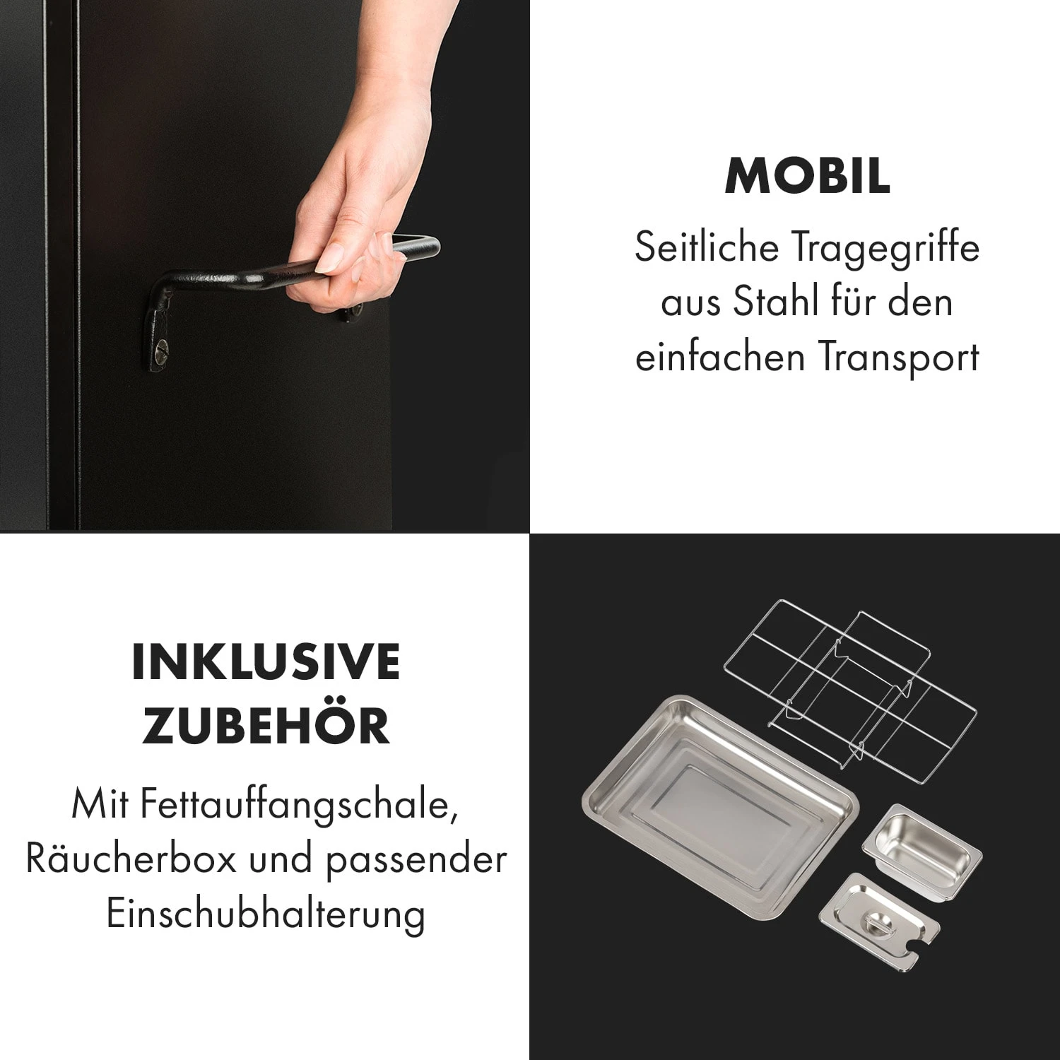 • seitliche Tragegriffe aus Stahl