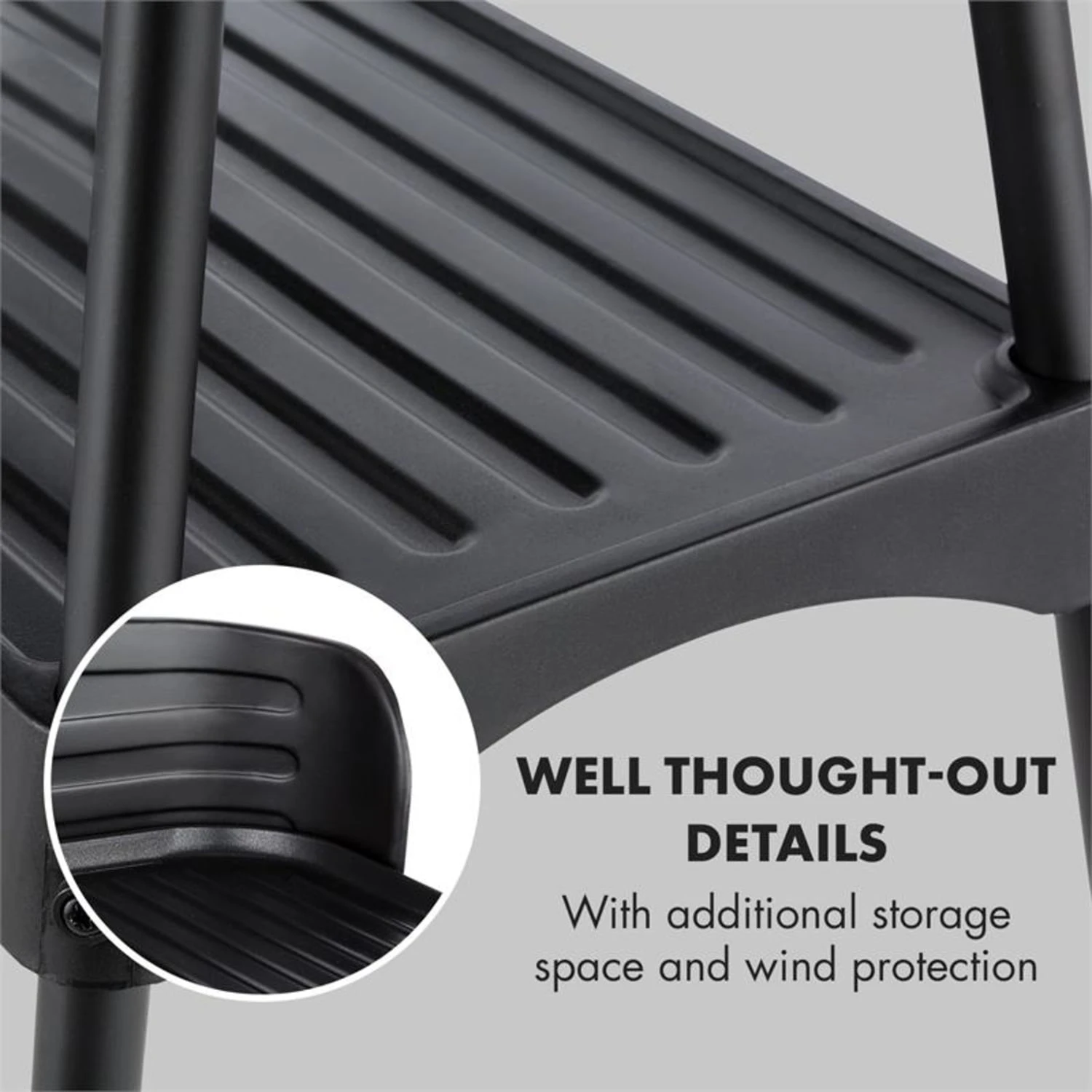 Am Standfuß des Porterhouse Elektrogrills befestigt ist eine praktische Ablage für Grillgut, Zangen oder andere nützliche Helfer. Zusätzliche Ablagemöglichkeiten ergeben sich aus den abnehmbaren Seitenteilen, die sich beispielsweise hervorragend für Gewürze oder Soßen eignen.